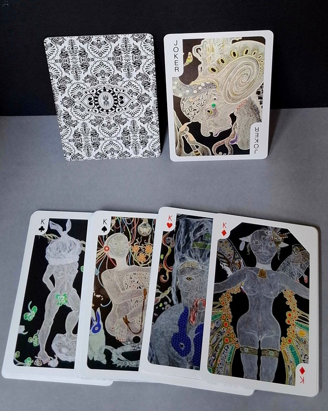 52+JOKER2枚の54絵柄全て、別作品の印刷トランプです。 裏面は黒ダマスク柄で統一プリント。 ソフトプラケースに入れてお届けとなります。 ご希望の方にJOKERへサインをいれさせていただきます。備考欄へ『サイン希望』とご記入ください。 サイズ:58×89/㎜(国際基準ブリッジサイズ) 絵柄ランダムサンクスドローイング1枚付き。 ※こちらの残部数で終売となります。再販は予定しておりません。