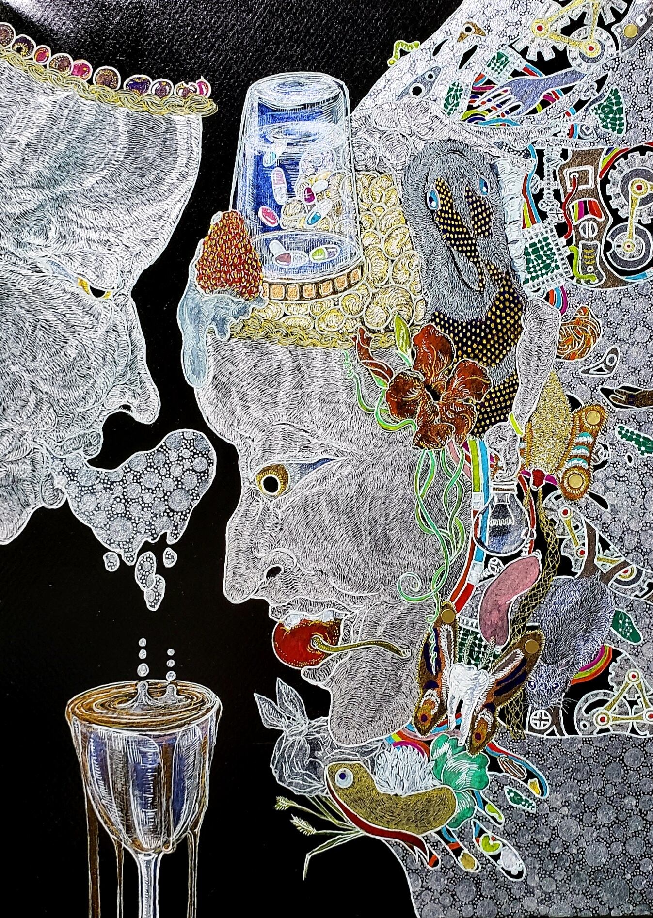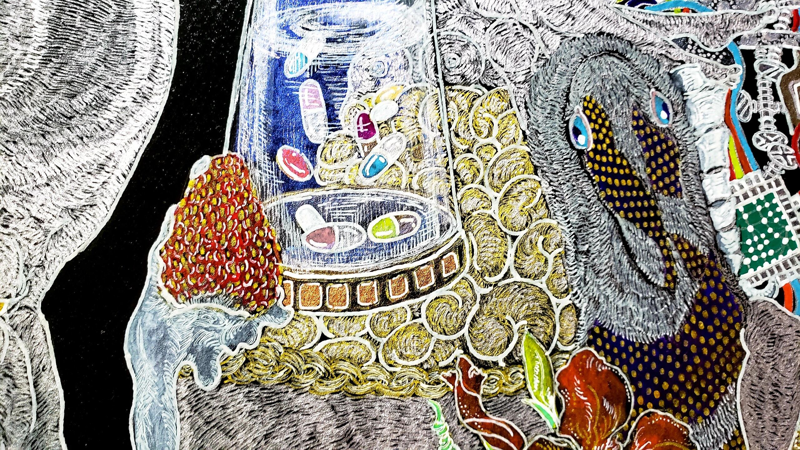 素材:木製パネルに紙、ペン、アクリル