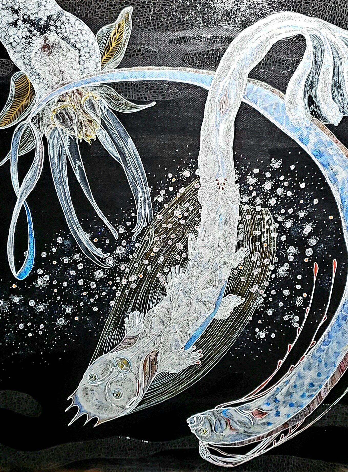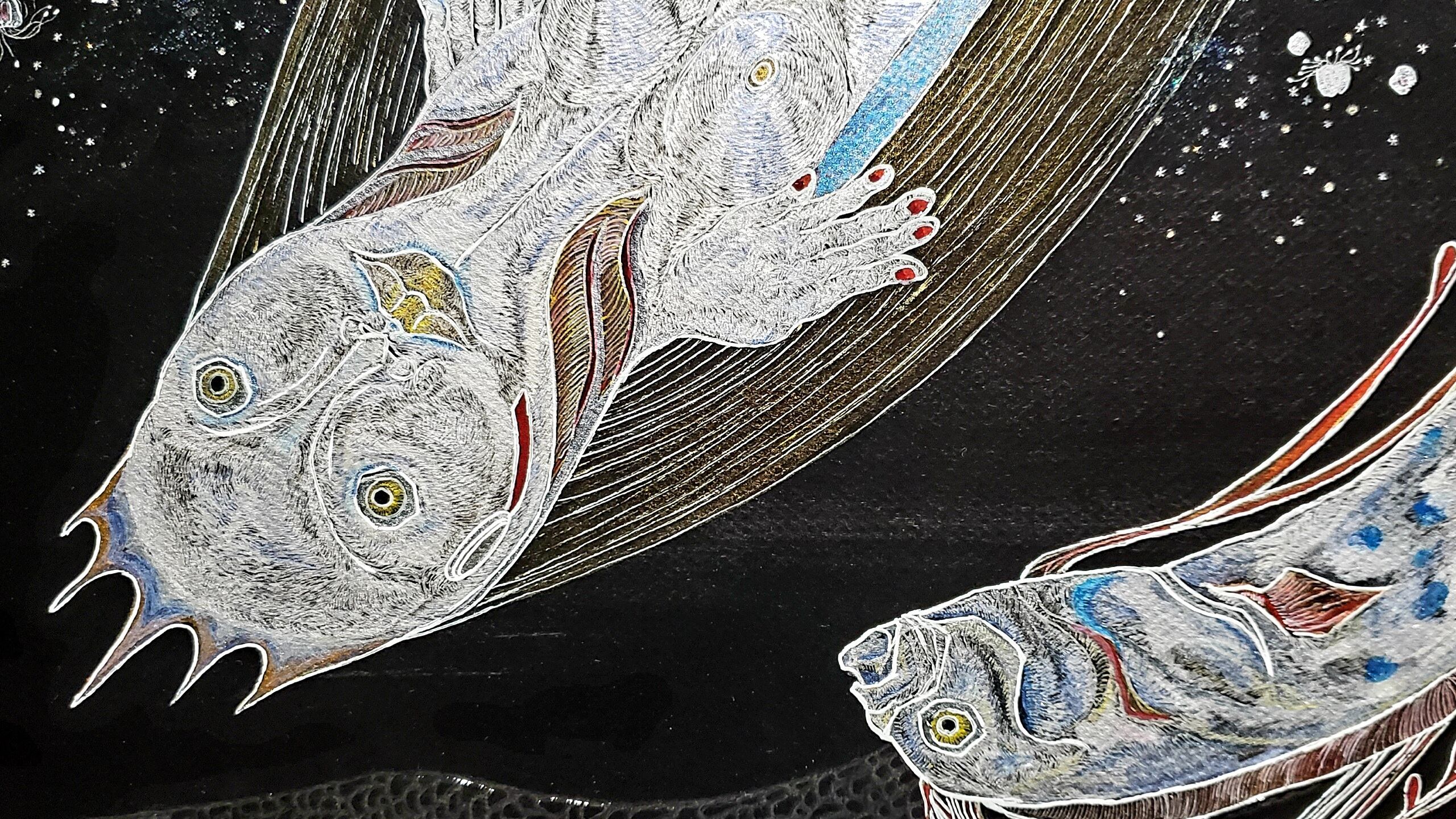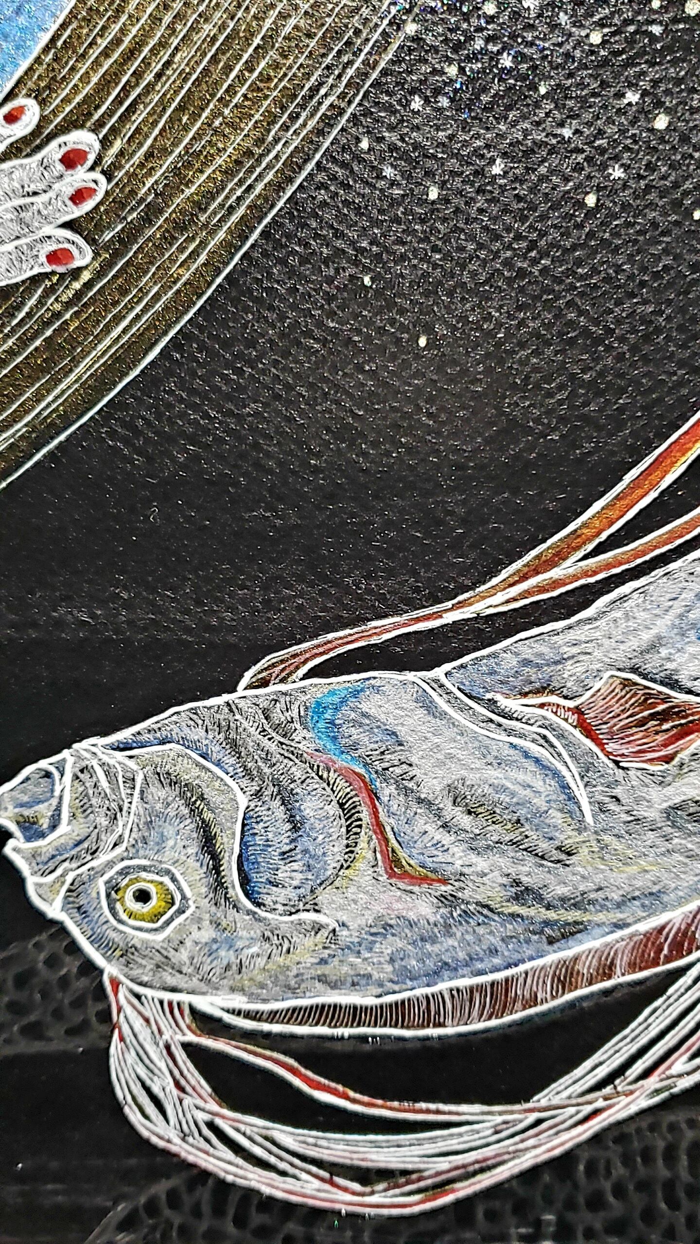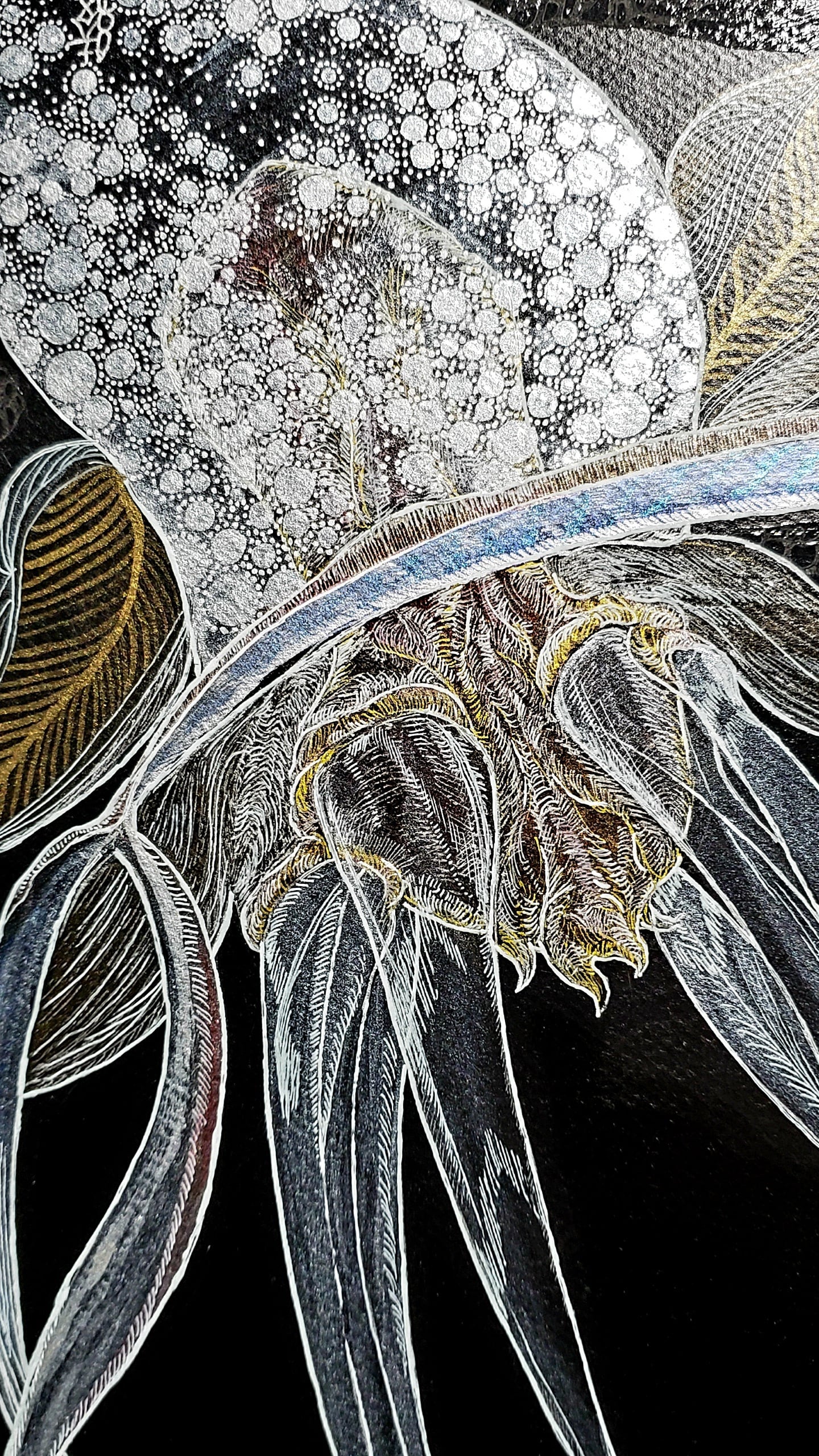・紙によるペン画主体の作品ですので、水分・直射日光・紫外線・調理による油煙・タバコの煙・ホコリやカビに敏感です。以上のような環境をある程度避け、額に入れた状態でご鑑賞いただけますと、より長く美しさが保たれます。
